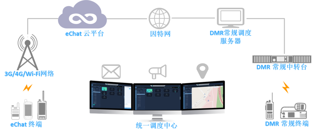 ✦ 统一调度:DMR专网和公网对讲实现了系统层面的全融合,互联互通,统一调度、无缝指挥。