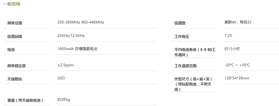 多级别的集群调度功能,满足用户不同组员进行通信,提高工作效率。机身采用人体工程力学设计,携带方便,便于长期使用。标配1600mAh本安型镍氢电池,按照5-5-90工作模式,完全充电后使用时间长达13小时。