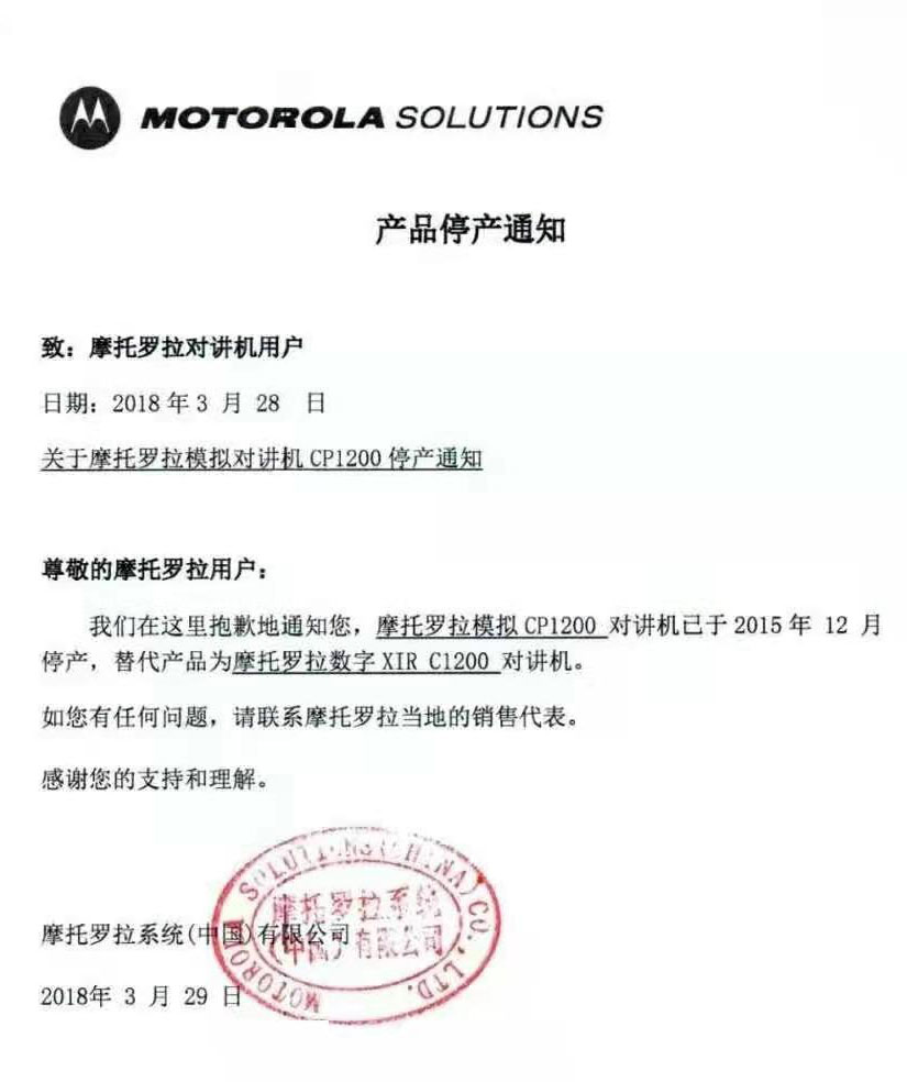 摩托罗拉根据国家相关要求,已停止摩托罗拉CP1200模拟对讲机的生产,同时按照国家有关规定该款型号的《无线电发射设备型号许可证》均不在办理延期手续。