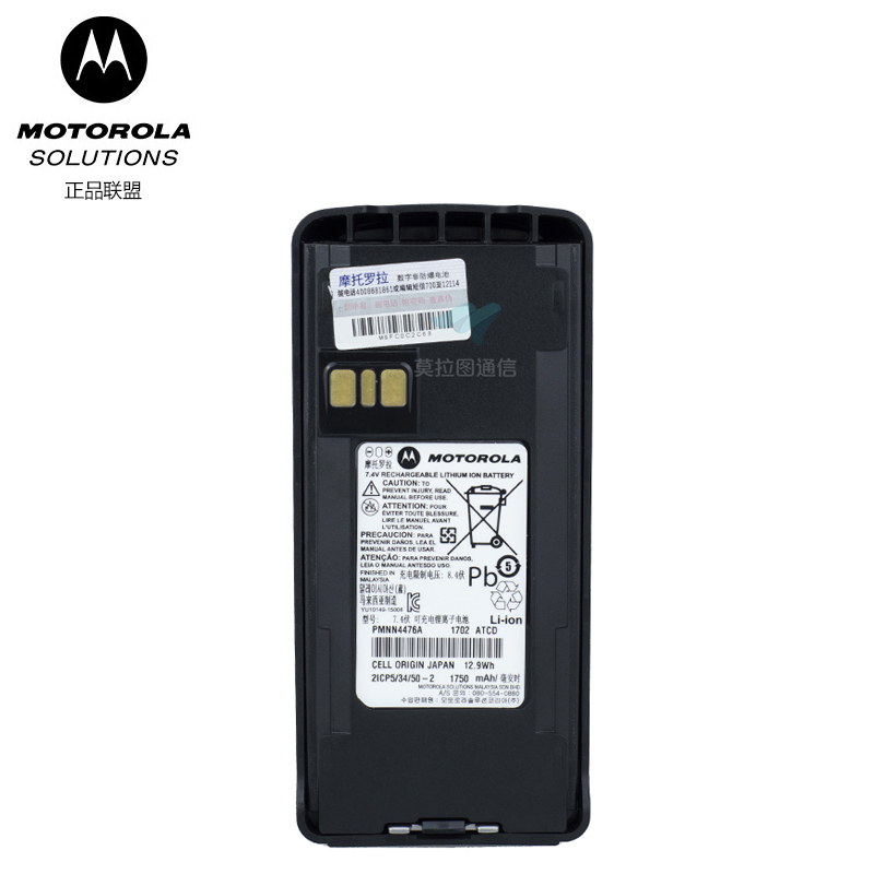摩托罗拉PMNN4476锂电池,电池容量为1750mAH。PMNN4476可适用于摩托罗拉XIR C1200、C2620、C2660及CP系列等机型。模拟模式下电池续航时间约为15小时,数字模式下电池续航时间约为20小时。