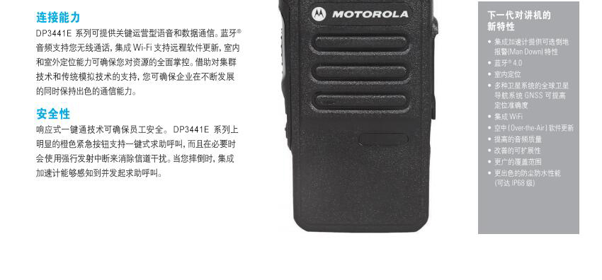 摩托罗拉DP3441e数字对讲机配备集成的蓝牙技术,可实现设备之间无线、及时地共享信息。DP3441e可承受跌落、受潮、水浸、尘土及污垢覆盖等严酷环境及条件的考验,在这些环境条件下仍然保持通信畅通。