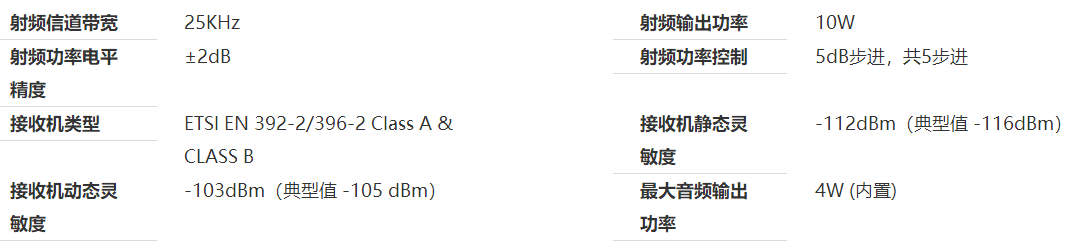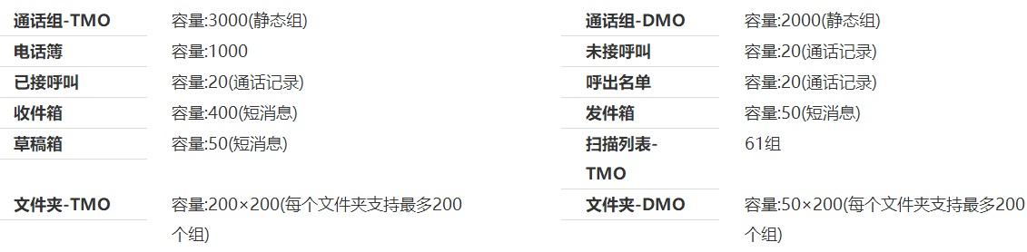 语音服务:单站集群模式;紧急呼叫(紧急呼叫默认组,紧急呼叫指定组,紧急呼叫个地址,紧急呼叫PABX/PSTN,热键,紧急轮询,LIP 信息发送,紧急静默呼叫(TMO));预占呼叫;组呼迟后进入;动态重组;通话组扫描;通话方识别;PTT锁定默认组;半双工(个呼(TMO & DMO),组呼,广播呼叫(TMO),个呼DTMF信令,网关呼叫,中继呼叫(DMO));全双工(TMO)(个呼,PABX,PSTN,DTMF);个呼限制;语音播报选组;快捷切换文件夹;调度员授权呼叫。