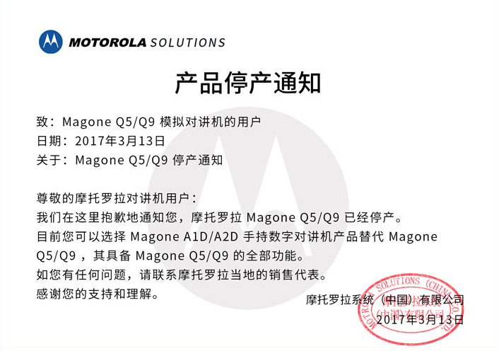 摩托罗拉MAG ONE Q5对讲机已停产退市