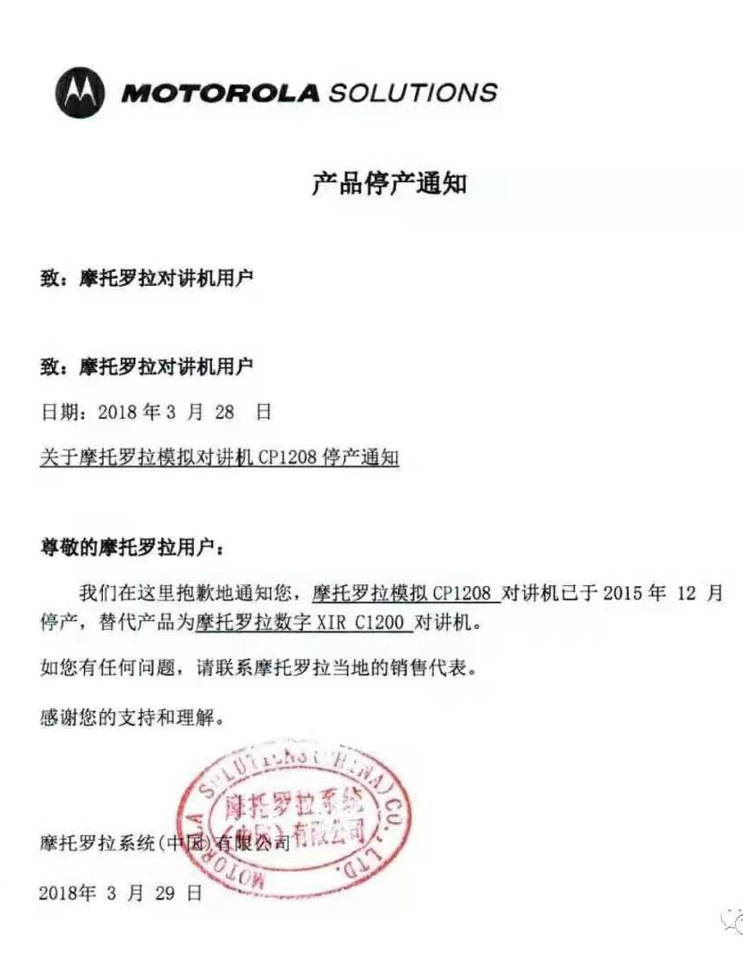 摩托罗拉根据国家相关要求,已停止摩托罗拉CP1208模拟对讲机的生产,同时按照国家有关规定该款型号的《无线电发射设备型号许可证》均不在办理延期手续。