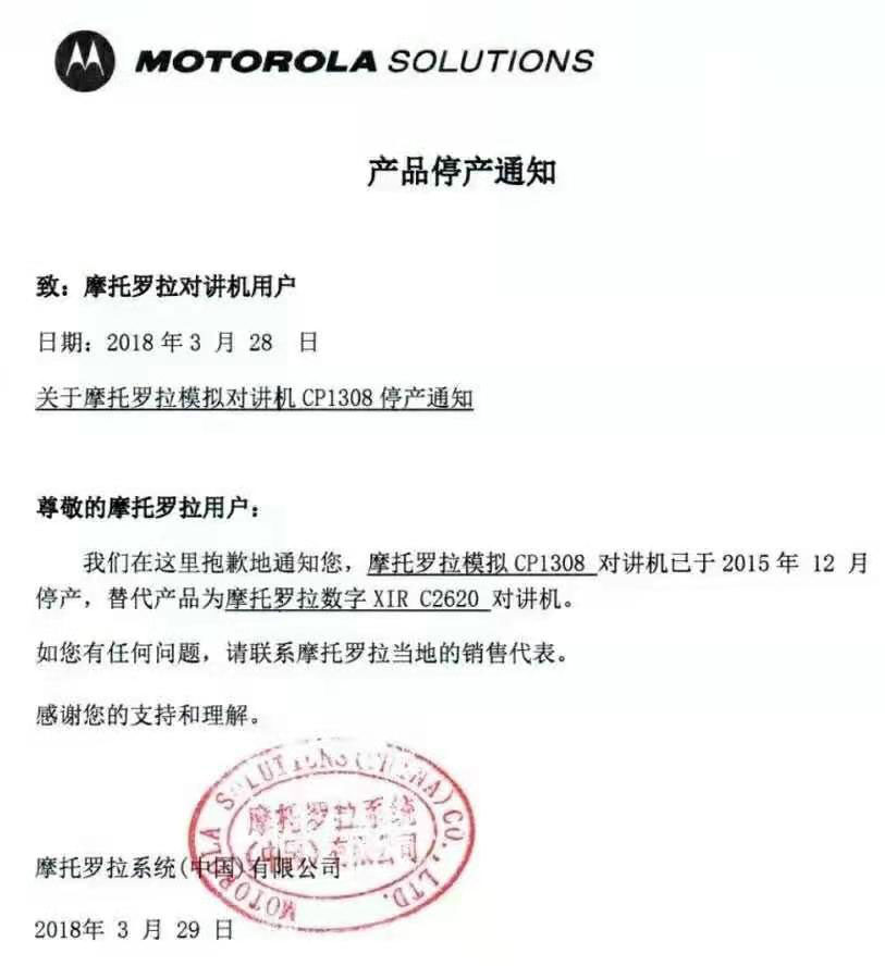 摩托罗拉根据国家相关要求,已停止摩托罗拉CP1308模拟对讲机的生产,同时按照国家有关规定该款型号的《无线电发射设备型号许可证》均不在办理延期手续。