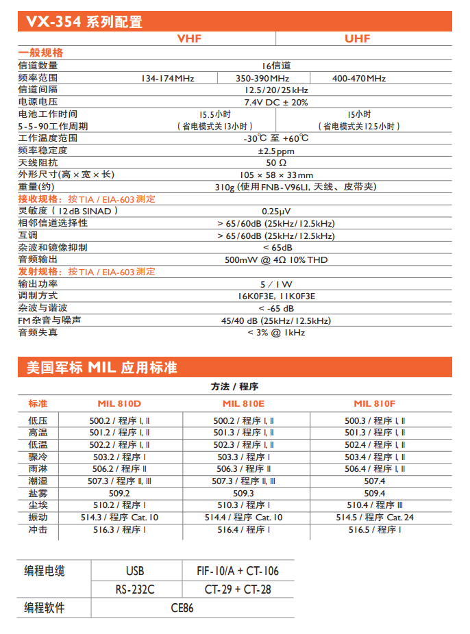 VX-354对讲机可配备容量达2000mAh的FNB-V96LI高级锂离子电池,即使在5W(5-5-90工作周期,在省电模式下)功率下工作,也可维持15小时以上。