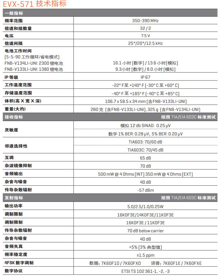 EVX-571对讲机符合国际标准 IP67,确保防尘防水,在 1 米深的水下长达 30 分钟的情况下,对讲机不会受到损害。