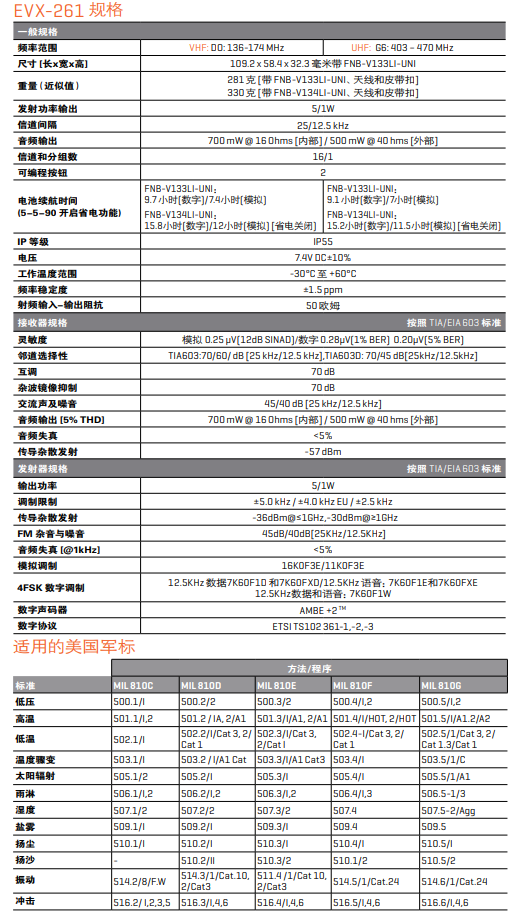 摩托罗拉(Motorola)威泰克斯EVX-261数字无线对讲机 一般特性 :• 信道容量: - 16 个信道/1 个分组 • 2 个可编程按键 • 安全特性: - 单独工作人员告警 - 紧急告警 • 使用通用电池系统 • 多种扫描选择 • 内置 VOX(需与 VOX 配件搭配使用
