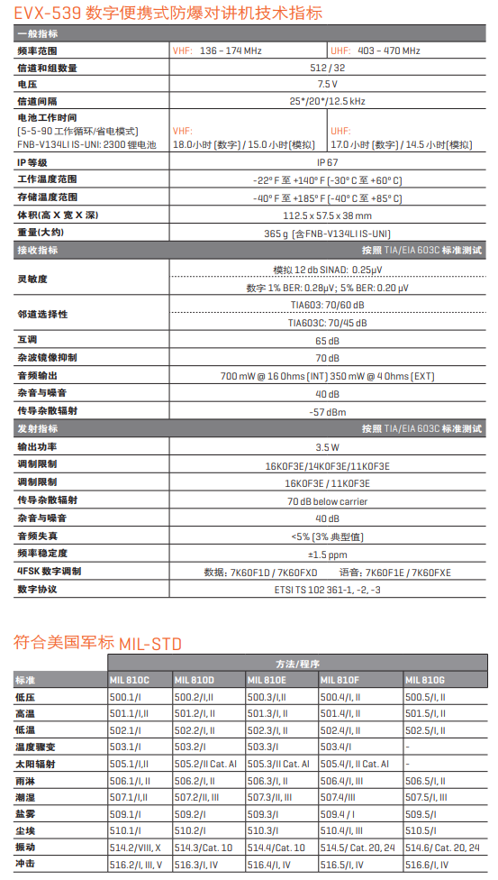 EVX-539 对讲机符合国际标准 IP67,确保防尘防水,在 1 米深的水下长达 30 分钟的情况下,对讲机不会受到损害。